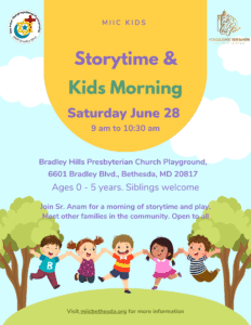 Join Sr. Anam for storytime and play with other kids on Saturday June 28 from 9 – 10:30 am at the Bradley Hills Presbyterian Church playground. Ages 0 – 5 years
