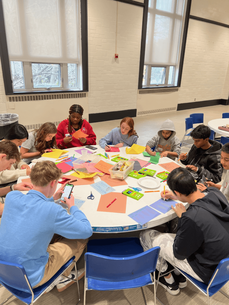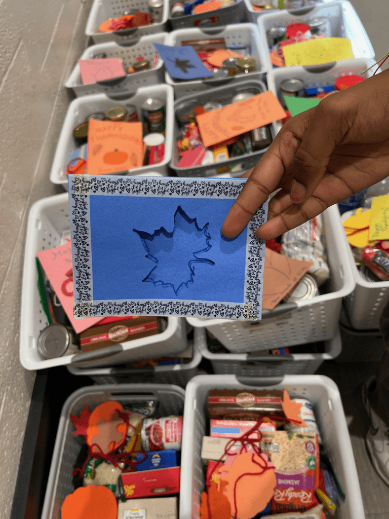 After the youth had some pizza and lemonade, they started assembling the baskets and making cards for the recipients.